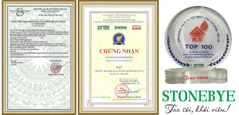 Từ khi có mặt trên thị trường đến nay, viên uống Stonebye vinh dự được trao tặng nhiều giải thưởng chứng nhận về chất lượng, trong đó có giải thưởng “Top 100 sản phẩm và dịch vụ tốt nhất cho gia đình và trẻ em năm 2019”.